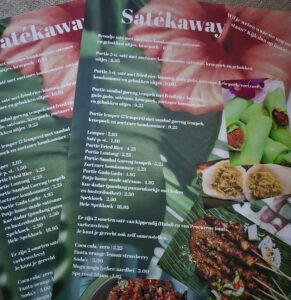 Naast saté biedt ze ook andere gerechten waaronder ook vegetarisch en veganistisch. In de flyer staat alles wat ze maakt, voor zaterdag zal er een selectie van zijn.